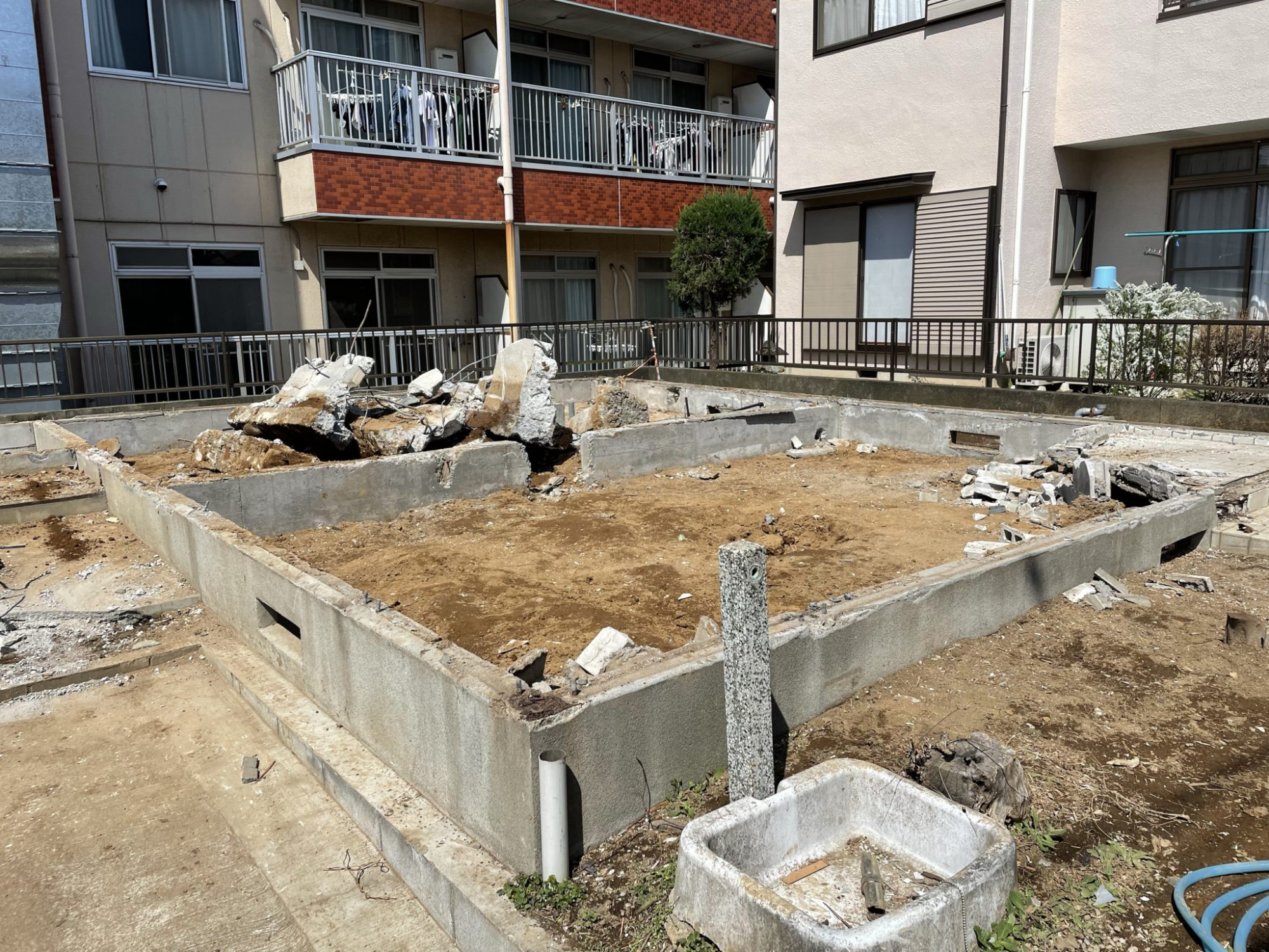 作業スペースが少なかったので植栽や花壇を撤去して作業スペースを広げて建物の周りに養生足場を設置しました。