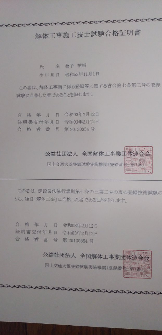 解体工事施工技師の試験に合格することが出来ました!